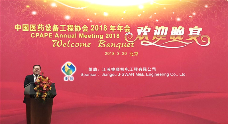 2018年3月20日,江蘇捷順公司參加了2018年中國醫(yī)藥設備工程協(xié)會年會。協(xié)會當天晚上的歡迎晚宴由我司贊助舉行,并且捷順公司董事長陳泓宇先生也作了歡迎致辭。